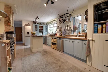 This beautifully presented four-bedroom link-detached bungalow offers stylish and versatile living, tucked away in a peaceful setting in Braunton. Behind its attractive modern façade with smart cladding and generous driveway parking, the home opens into a stunning open-plan living space filled with natural light. Vaulted ceilings with skylights, exposed beams, and bi-fold doors create an airy and inviting atmosphere, while the feature wood-burning stove adds a cosy focal point.