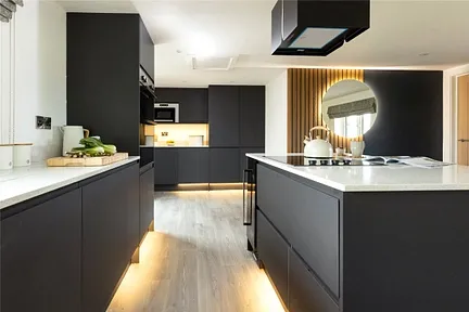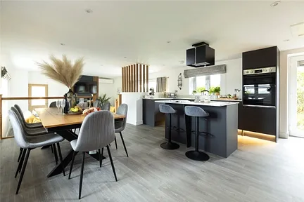 Steps lead up to the open-plan dining and kitchen area, where sleek matte black units offer ample storage. The kitchen is well-equipped with an integrated electric oven, hob, fridge/freezer, dishwasher, washing machine, and dryer. A central island adds additional storage and features a built-in ceramic electric hob and space for sitting at the breakfast bar.