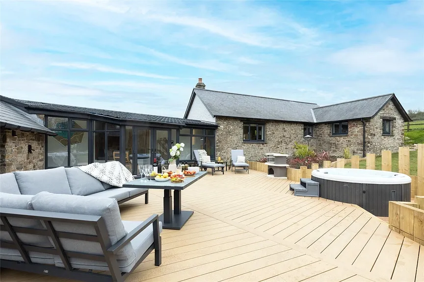 The charming frontage boasts a generously sized, level landscaped lawn, complemented by an expansive composite decking area that adjoins the property. This creates the perfect space for outdoor seating, complete with a BBQ and hot tub, offering an ideal setting for entertaining and enjoying the outdoors.