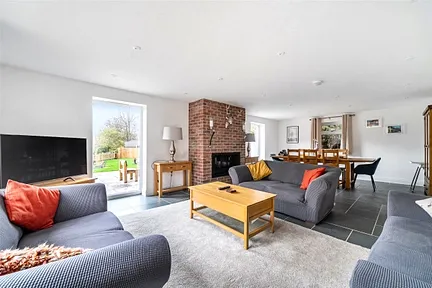 The sitting and dining room is a beautifully proportioned, triple-aspect space with views extending down the valley to the sea beyond. A raised firebox set within a brick chimney breast provides a focal point, while sliding glass doors open onto the broad balcony and terrace, seamlessly linking indoor and outdoor living.