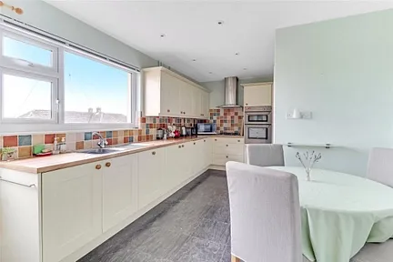 The generous kitchen and dining area is well-fitted with a good range of wall and base units, integrated eye level oven, gas hob, *integrated dishwasher, integrated fridge, ample worktop space, and room for a table and chairs. This space enjoys a lovely open outlook across the rear garden and rooftops to the countryside beyond, making it a delightful area for family living or entertaining.