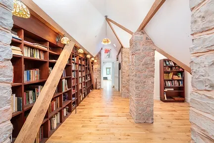 The accommodation on the second floor takes on a more contemporary loft-style feel, with large vaulted ceilings, exposed timbers and wonderful natural light. An open-plan library area leads through to a second sitting room — a peaceful space to retreat and relax.