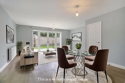 The heart of the home is the expansive open plan living area, designed with modern lifestyles in mind. This beautifully presented space seamlessly incorporates a generous lounge and dining area, ideal for family gatherings or entertaining guests, and features French Doors that open out onto the rear garden, allowing natural light to flood the room.