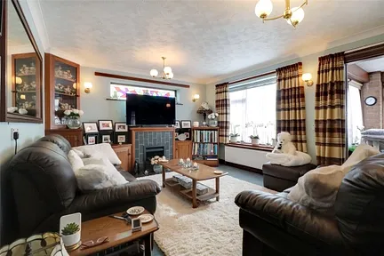 The warm and inviting living room features a central coal-effect gas fire, complemented by a stained-glass window above that casts light into the dining area. This spacious room easily accommodates sizeable furniture and is further enhanced by sliding doors that open into a rear sunroom, offering additional seating and direct access to the garden. French doors lead into the adjacent dining room, providing ample space for a family dining table and chairs, making it a wonderfully sociable area for entertaining.