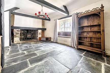 To the rear of the house, the kitchen is fitted in a shaker style with slate flooring, ceramic sink, Quooker boiling water tap and integrated appliances. Beyond lies a boot room and a characterful family room with exposed ceiling timbers and a further wood-burning stove, creating a comfortable everyday living space. An elevated former apple store, with restricted ceiling height, provides a flexible additional room suitable for hobbies, occasional accommodation or home working.