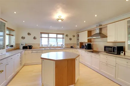- Large kitchen fitted with a vast array of cupboards and matching attractive central island.