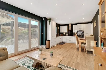 As you enter, you are greeted by a welcoming entrance hall with under-stairs storage, and access to a cloakroom WC. The heart of the home is the impressive open-plan 24'10 Kitchen/Dining/Family Room, which boasts bi-fold doors that seamlessly connect to the garden, filling the space with natural light. The dual-aspect 21'2 living room provides a cosy retreat with views to the front and side.
