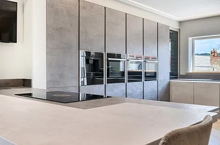 kitchen features a suite of integrated NEFF appliances, including two single ovens, a coffee machine, and a