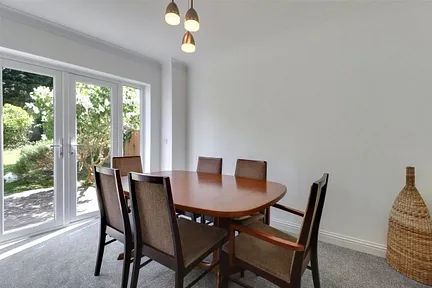The dual-aspect kitchen is fitted with a range of eye-level and base units, and includes an electric oven, hob, and fridge/freezer, along with space for freestanding washing appliances. French doors at the rear of the kitchen open directly onto the garden, creating a lovely connection between indoor and outdoor living. Just off the hallway, a separate dining room provides ample space for a large family table and chairs and also features French doors leading to the rear garden. Completing the first floor is a convenient WC accessed from the hallway