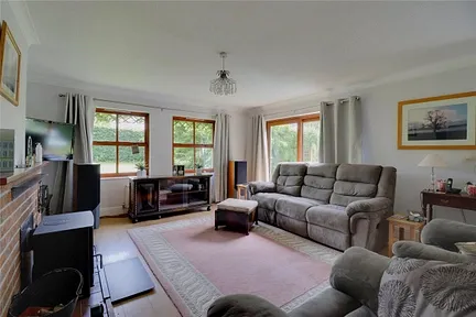 Outside, the property sits within attractive, mature gardens with lawned areas, shrubs, trees, a wood store and garden sheds. A wisteria frames the front of the house, and a driveway provides parking for two to three cars, in addition to an attached double garage.
