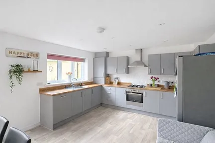 The ground floor opens with a welcoming hallway and a convenient downstairs cloakroom. At the heart of the home is a spacious kitchen dining room, ideal for both everyday living and entertaining, with French doors opening directly onto the rear garden and garden. A separate lounge offers a comfortable retreat with views out to the garden.