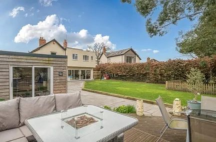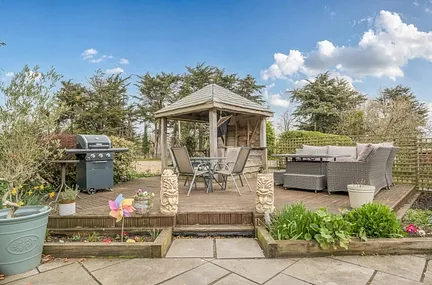 Outside, the property is approached via a large private driveway and turning area sit well back from the road, offering both privacy and ample parking. The generous rear garden is a genuine lifestyle space: sweeping lawns lead down to open countryside, while a raised deck, currently home to a hot tub beneath a tiled roof gazebo creates an inviting spot for relaxation and entertaining.