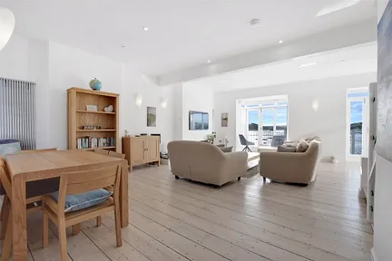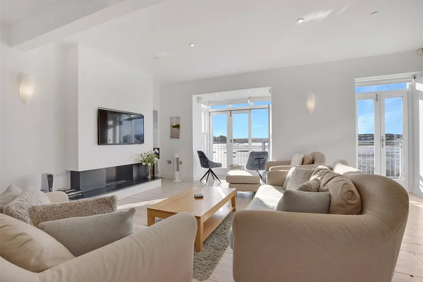 Stairs rise to the first floor where the accommodation truly comes into its own. Here, an outstanding open-plan living, dining and kitchen space has been thoughtfully designed to maximise the exceptional estuary views. Expansive glazing and bi fold doors to the front flood the room with natural light and open directly onto a balcony over looking the estuary – the perfect spot for morning coffee, sundowners or simply watching the ever-changing tides. The contemporary fitted kitchen provides ample preparation and storage space, alongside room for a large family dining table, while the sitting area offers a relaxed setting for entertaining and gathering. To the rear, further bi-fold doors open onto a private area of composite decking, enclosed by substantial stone walls to create an intimate and sheltered space for alfresco dining.