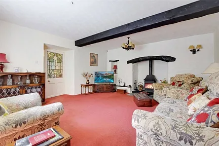 Step inside through the front door and you are welcomed into a spacious and light-filled entrance hallway that forms the heart of the home. To the right lies the main living room, a generous and inviting space featuring a stunning fireplace with a wood-burning stove inset—ideal for cosy evenings during the colder months. This room enjoys pleasant views to the front garden.