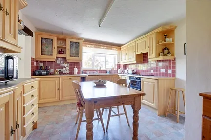To the left of the hallway is a formal dining room, which doubles beautifully as a secondary sitting room. This versatile space flows seamlessly into the kitchen/diner, creating a sociable layout that works well for both day-to-day living and entertaining. The kitchen is well-appointed with ample worktop space and cabinetry, ideal for keen cooks and busy households. A walk-in pantry cupboard adds further practicality and excellent storage options.