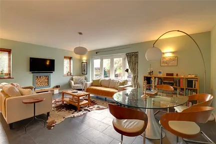 The ground floor enjoys modern, light-filled interiors with underfloor heating, centred around a well-equipped contemporary kitchen flowing seamlessly into the sitting/dining room. Large bi-fold doors open directly onto the rear garden, creating an excellent space for both everyday living and entertaining. Also on the ground floor are two double bedrooms, a family shower room, utility room, WC and a striking vaulted entrance hall which sets the tone on arrival.