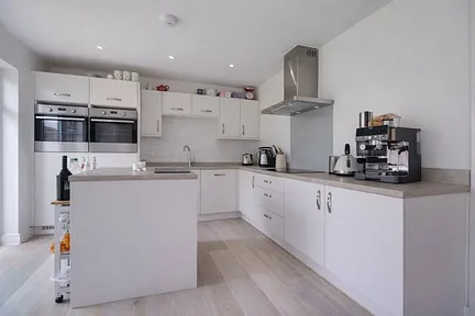 To the first floor, the property truly comes into its own with a stunning open-plan living, dining and kitchen area that is bathed in natural light. Bi-folding doors open directly onto the enclosed rear garden, creating a seamless indoor-outdoor feel that is perfect for both everyday living and entertaining. The kitchen is fitted with a comprehensive range of wall and base units, offering excellent storage and complemented by a suite of integral appliances including two ovens, fridge, freezer and dishwasher.