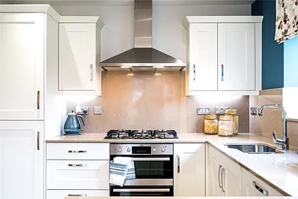 As you step through the front door, you’re greeted by a spacious open-plan kitchen and dining area. The L-shaped kitchen, complete with a central island, creates a welcoming space perfect for cooking, entertaining, or catching up with family over dinner. A utility room with a handy back door offers direct access to your parking spaces - ideal for bringing in shopping or unloading the car with ease.