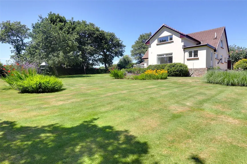 Where does one start is the question. The front garden is open plan with lawn behind a low stone wall with stained timber rail fencing and studded with shrubs that harmonise with the Devon hedgerow on the edge of the fields opposite. Access to the rear garden is down either side of the house and on one side is found a southerly facing courtyard style terrace complete with tumbling water fall feature and ornamental pond. Not a bad place to have a mid-morning mug of something listening to the soothing sounds of the water. It is clear to see over the years a lot of thought has gone into the plants and shrubs within the garden and at this time of year they provide a wonderful colourful break before the woodland beyond. Old azaleas waft their scent across the lawns whilst rhododendrons and the mature trees provide structure particularly along the Devon bank dividing the garden from the paddock.