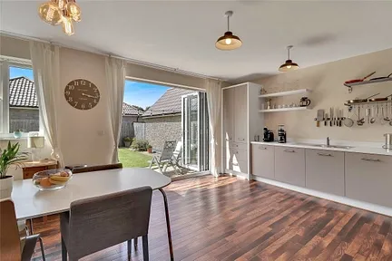 Moving through to the rear of the property, the spacious kitchen/diner provides a superb heart of the home. Well-appointed and thoughtfully arranged, it offers ample space for cooking, dining, and socialising, with French doors opening directly onto the enclosed rear garden. This outdoor space is neatly landscaped, featuring a combination of lawn and patio areas, ideal for al fresco dining or simply enjoying the sunshine. The garden also provides pedestrian gated access to the driveway, which offers parking for a couple of vehicles, and in turn leads to the detached single garage.