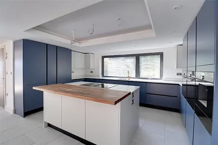 Reception space is located on the top floor and has been thoughtfully arranged to take full advantage of the far reaching views and garden access. The exquisite kitchen/dining room is a sociable and stylish space, equipped with quartz worktops and upstands, a Rangemaster sink with boiling water tap, and soft close base units with carousel and pull out shelving.