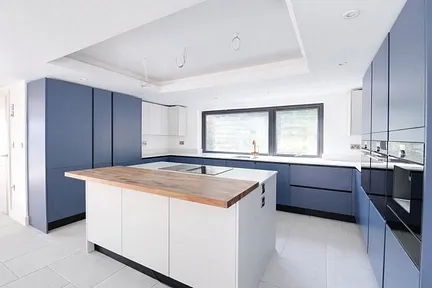 Reception space is located on the top floor and has been thoughtfully arranged to take full advantage of the far reaching views and garden access. The exquisite kitchen/dining room is a sociable and stylish space, equipped with quartz worktops and upstands, a Rangemaster sink with boiling water tap, and soft close base units with carousel and pull out shelving.
