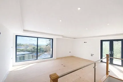 The first floor houses three further bedrooms, including bedroom three which benefits from a Juliet balcony. The standout principal suite features a striking floor to ceiling window that maximises natural light, as well as a luxurious en-suite with walk in shower and freestanding bath. A large, southwest facing roof terrace adjoins the main bedroom, providing a private and elegant outdoor retreat.