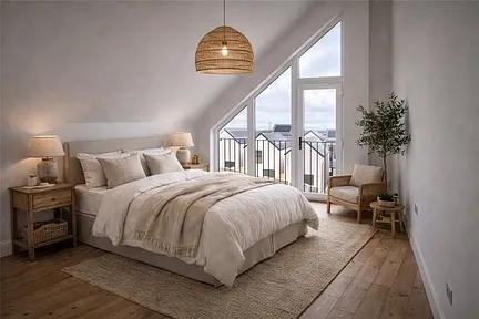 Across the upper floors, well-proportioned bedrooms sit beneath vaulted ceilings that bring light, height and character, creating calm, private retreats for every member of the household. The flexible layout adapts effortlessly as life evolves, whether for growing families, visiting guests or a light-filled home office.