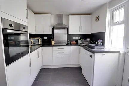 A short flight of stairs ascends to the modern and recently fitted kitchen which enjoys an array of white units both above and below a dark coloured working surface. The integrated electric oven, hob and extractor are included within the sale. An external door allows access to the garden.