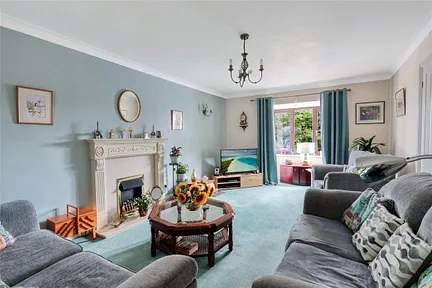 The dual aspect sitting room is both generous and inviting, enhanced by a feature marble effect fireplace, box bay window framing the front garden and double glazed patio doors open to the rear garden seamlessly blending indoor and outdoor living.