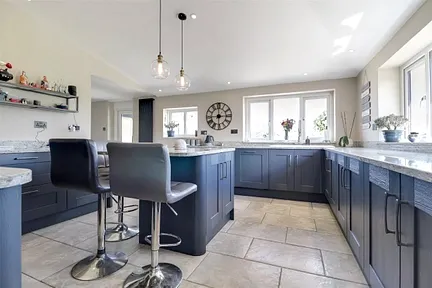 As you enter the main farmhouse, you're greeted by a welcoming and spacious entrance hall that leads into a series of characterful living spaces with downstairs shower room. The principal sitting room is centred around a large feature fireplace with wood-burning stove, perfect for cosy evenings. Adjacent is a second reception room, which offers flexibility as a formal dining area, snug, or study.