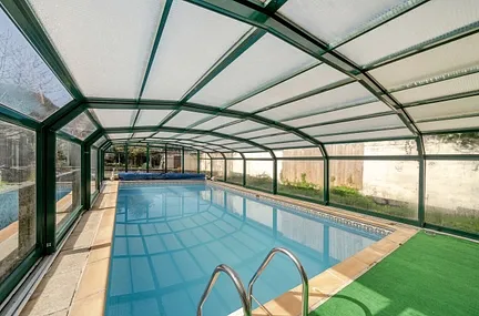 A standout feature of this exceptional home is the outdoor swimming pool, complete with a glass canopy cover designed to retain heat and extend usability throughout the seasons—offering a true lifestyle element rarely found in properties of this kind.