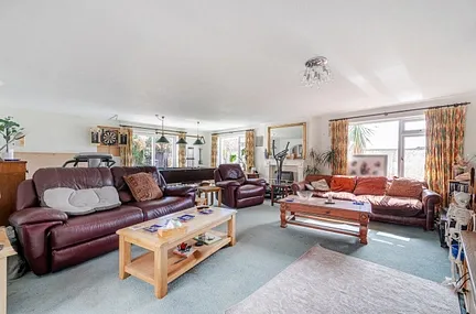 Internally, the home is thoughtfully arranged and perfectly suited to modern family living, offering a wealth of flexible accommodation. A welcoming entrance hallway leads to a beautifully proportioned living room. This inviting space features sliding doors opening directly onto the patio, allowing natural light to flood in and creating a seamless connection to the outdoors. The living space continues into an impressive extended family room measuring approximately 26’ x 20’, forming an L-shaped layout that is ideal for both relaxation and entertaining. With a further set of sliding doors leading onto the same patio, this area is particularly enjoyable during the warmer months, effortlessly blending indoor and outdoor living.