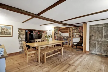 Heading back through the kitchen, the hall leads into the dining room, an elegantly finished space with wooden flooring underfoot and beamed ceilings above, and symmetrical oak window seats. The fireplace commands attention in this room giving a lovely warmth and character to the space. There is plenty of room available for a large dining table in here, allowing for the whole family plus guests to enjoy mealtimes together. One end of the room has custom-made bookshelves, providing a perfect reading nook.