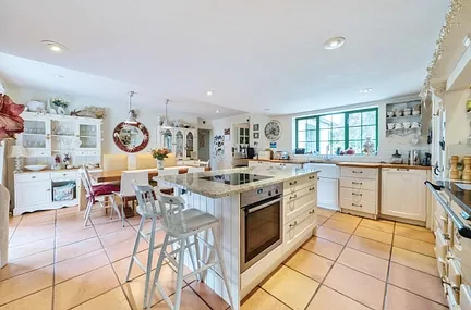 A handy boot room opens onto the rear gardens with cloakroom off. A snug that overlooks the kitchen leads to the beautiful sitting room with multiple windows overlooking gardens and countryside views. A wood burner is a welcome addition on colder days.