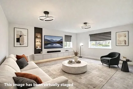 The double garage, fitted with an electric door and a personnel door into the utility room, adds everyday convenience, while additional driveway parking for two vehicles ensures practicality for busy households.
