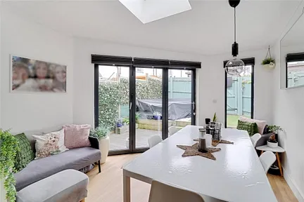 The heart of the home is undoubtedly the extended open-plan area, where the kitchen features a central breakfast bar and a range of contemporary integral appliances including built-in ovens, a gas hob, dishwasher, and ample storage. This sociable space flows effortlessly into a generous living and dining area, where bi-fold doors span the rear wall and open onto the south-facing garden, flooding the room with natural light and offering a seamless transition between indoor and outdoor living. Also on the ground floor, there is a practical WC which has been cleverly designed to accommodate white goods, making it an ideal utility space.