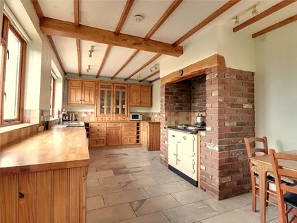A fine 23’ reception hall with oak flooring runs from one side of the house to the other culminating in a conservatory overlooking and with doors into one part of the garden. The sitting room with bay window seat and an impressive stone and brick fireplace with log burner sat upon a raised hearth, is a delightful cosy southerly facing room. The dining room on the opposite side of the hall also enjoys the same orientation and has an equally impressive fireplace with a wood burning stove sat upon a raised hearth with adjacent storage cupboards on either side. The kitchen breakfast room is a delightful double aspect room with windows both on the southern and western side and a stable door leading out. There is an extensive run of block work surfacing with a range of wall, floor cupboards with drawers, bottle racks and spice drawers. A cast iron Esse range cooker nestles in a large brick faced recess giving a warmth to the kitchen and is especially pleasant to stand beside after having been outside on cold day. Finishing off the accommodation downstairs is a good sized utility room and large cloak/shower room.