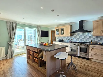 The spacious open plan sitting and dining room is both sociable and beautifully arranged. The sitting area is a superb space, featuring recessed downlighting, a split level ceiling, and a south facing bay window enjoying delightful views over the garden. A ceiling mounted fan enhances comfort, while a striking stone fireplace with a polished stone hearth houses a wood burning stove, creating a warm and inviting focal point.