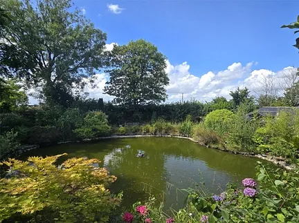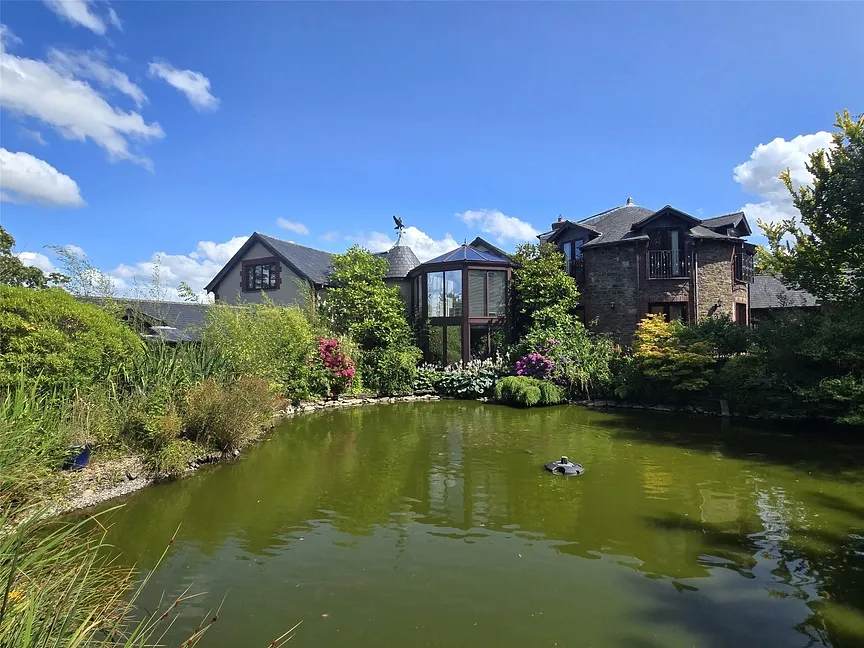 Beyond the gate found adjacent to the double garage on the main drive, you enter your own world where the stature and shape of this unique home comes into its own. Two things strike you immediately, one being the curvature of one part of the house and the other is the large BBQ area running along what was formerly an indoor swimming pool but is now a delightful, spacious guest suite. The property offers external elevations of brick, stone and colour wash render under a slate roof. Opening the front door, you are greeted by an impressive vaulted reception hall, complete with lift entrance, where you get a sense that this home is really something quite special. The fine Oak staircase makes quite a statement. A wide arch opens into the curved drawing room which has no less than four sets of opening double doors to the outside and a Minster Stone fireplace with log burner providing a focal point. What an ideal place with which to entertain and one can only imagine the enjoyment to be had during the summer afternoons and evenings in this room with all the doors open, listening to the sound of the fountain outside. From the hall a small flight of stairs leads down into an inner hall where the study, cloakroom, a large store cupboard and door to the outside are found. Double doors lead into the impressive 28’kitchen/breakfast room which is another wonderful entertaining space complete mood lighting and featuring an extensive range of wall, floor and drawer units with associated polished granite work surfaces, island unit complete with sink and Quooker instant hot water tap. Appliances include a Rangemaster induction hob with double oven hob, extractor, microwave, dish washer, coffee machine and a Rangemaster double door fridge freezer. A honeyed Oak floor offsets the cream and black from the kitchen units and worksurfaces beautifully, and gives a lovely warm feel throughout the room. The flooring continues through the double doors into the garden/sun room which has almost full height glazing overlooking the pond. Sitting in here you get a sense of calm with the pond outside and the sound of the water tumbling down from the fountain. Opening up from the kitchen a rear hall gives access via a side door out to the second driveway and a further door connects to the double garage. A spiral staircase leads to the upper floor Annex which has an open plan sitting room/ kitchen/bedroom. The kitchen area has a full range of matching wall and base units, integrated fridge freezer, double oven and four ring electric hob and along run of worksurface with bistro bar at on end. On a clear day, Dartmoor can be seen in the distance beyond the village church on one side of the annexe and on the other are far reaching rural views across the fields. A bathroom with three piece suite completes the accommodation. Planning has been passed to create further accommodation (Torridge District Council 1/1071/2022/FUL). Accessed through the double garage is a large utility/laundry/boiler room complete with extensive units, work tops, appliance space, two boilers serving the hot water and heating. Rounding off the accommodation is a plant room complete with geothermic ground source heat pump, running gear for the photo voltaic panels found on the guest suite roof and a gardener’s WC. whilst a door leads out into the rear garden.