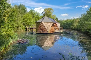 This is the most amazing geodome structure, with part copper tiled roof, that was subject to a TV programmes during its design and build. Approached across a wooden walk bridge Xanadu gives the appearance of hovering above the water and stepping inside this 40’ space is quite an experience. Large bifold doors with decking outside overlook the water whilst the open plan space with hexagonal ends gives a feeling of light and airiness, having a sink midway, with bespoke copper pipe taps above protruding from a wavy birch panel. Leading off is a cloakroom WC.