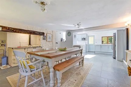 Inside, the main house opens into a spacious entrance hallway which creates a welcoming first impression and provides access to both the principal accommodation and the self-contained annexe. To the front of the home, the main living room is a warm and inviting space, housing a feature fireplace with a wood-burning stove and lovely views over the front garden. However, the real heart of the home is the spectacular open-plan kitchen, dining, and family room. Cleverly extended by the current owners, this bright and spacious room offers a perfect balance of contemporary styling and traditional character. The kitchen is superbly equipped with a range of high-end integrated appliances, sleek cabinetry, and a sociable breakfast bar, making it ideal for both entertaining and everyday living. The adjoining dining area is large enough for a family-sized table and enjoys the warmth of an oil-fired AGA set into a charming fireplace.