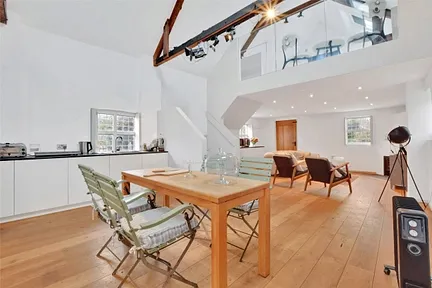 The main residence is a spacious and elegant 4-bedroom home, brimming with character and period features. Upon entering, the entrance hallway leads into a modern kitchen and breakfast room, complete with stylish slate work surfaces and attractive cabinetry. A door from the kitchen opens into a superb open plan living room/dining area, where large windows flood the room with natural light. A stunning fireplace adds to the room's charm.