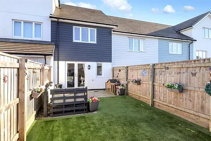 The rear garden is cleverly landscaped for easy upkeep and maximum enjoyment, blending a paved patio area and artificial grass. Its sunny position and cosy seating area make it an ideal retreat for alfresco dining and laid-back outdoor living. To the front of the property is an allocated parking space.