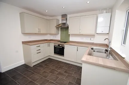 This home offers modern presentation throughout and a layout that feels easy to live in from the outset. The entrance opens into the kitchen, which is fitted with cream wall and base units and arranged to make good practical use of the space. There is a stainless steel sink, a built in single oven, ceramic hob with hood above, plumbing for a dishwasher or washing machine, and space for a freestanding fridge freezer. A front facing window brings in natural light and keeps the room feeling bright and functional.