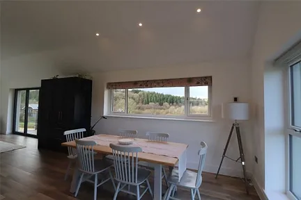 The first floor offers a generous open plan living area which has been designed to enhance the stunning countryside views with large windows and patio doors leading out to a private balcony. The kitchen/dining area is very spacious with a central island in the kitchen and modern appliances including the oven, dishwasher, fridge/freezer and wine fridge. There is a separate utility room with space for a washing machine, cloak room and a cosy living room.