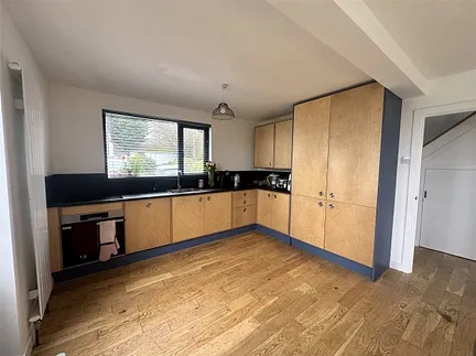 The kitchen is fitted with a range of wall and base units in a warm wood finish, complemented by